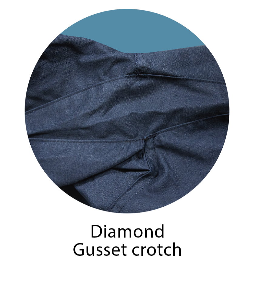Gusseted Crotch: Move with unrestricted ease. The gusseted crotch design enhances your range of motion.